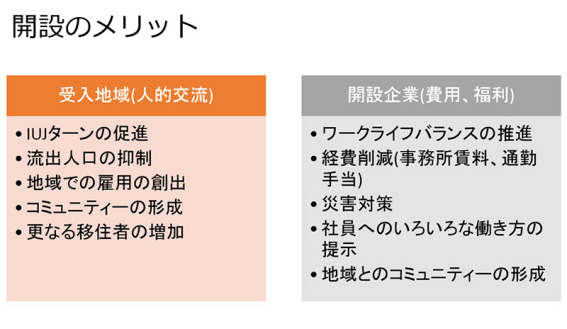 都市部は人材の取り合いになっており、いい採用に繫がらないことも多くなってきました。その点、田舎では働き口を探している人もいますし、地元にIターン・Uターンする人も最近は増えてきました。 そして何より、転職や就職を考える基準に“働き方”を重視する傾向が増えてきたことや、社員のライフスタイルを充実させる取り組みをしているという姿勢が、企業のイメージアップにも繫がるなどのメリットがあります。